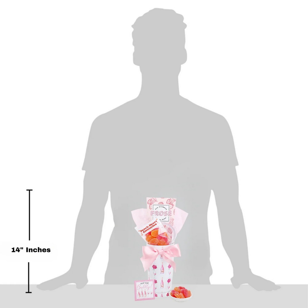 Contents: Pink Strawberry Frose, Peach Heart Gummies (2oz.), Tall Rose Stainless Steel Tumbler Cup with lid.